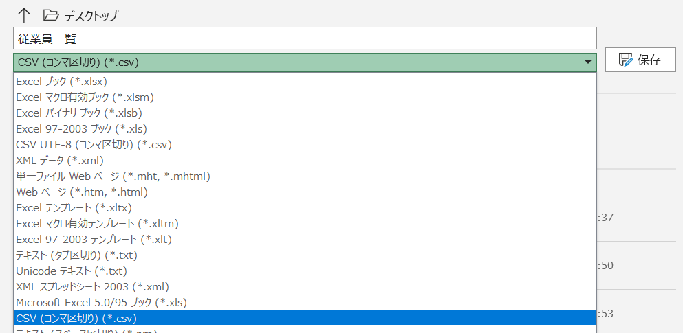 2.ファイルの種類は「CSV(コンマ区切り)」もしくは「CSV UFT-8(コンマ区切り)」を選択します。