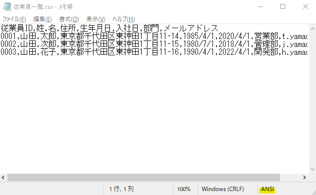 0003,山田 花子,ヤマダ ハナコ,1990/4/1,2022/4/1,営業部,t.yamada@xxx - CSVからExcelへ変換