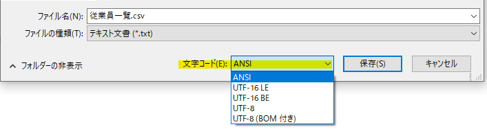 5.インポート先に合わせて文字コードを適宜 変更し、保存します。
