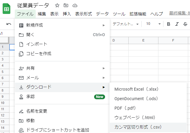 1.ファイル>ダウンロード>カンマ区切り形式(.csv)を選択します。