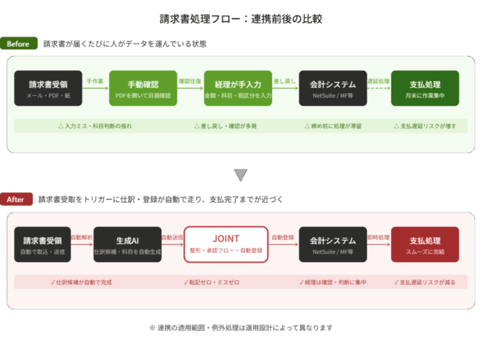 アフターでは、請求書受取システムに請求書が取り込まれたタイミングを起点に、JOINTが生成AIへ必要情報(請求書の明細や摘要、取引先、過去の科目ルールなど)を渡し、仕訳候補を作ります。生成AIの出力はそのまま確定させるのではなく、「候補」として扱い、最終判断は経理の承認に寄せる設計にすると安全です。承認されたら、JOINTが会計システムへ伝票登録まで連携し、支払処理に進める状態になります。