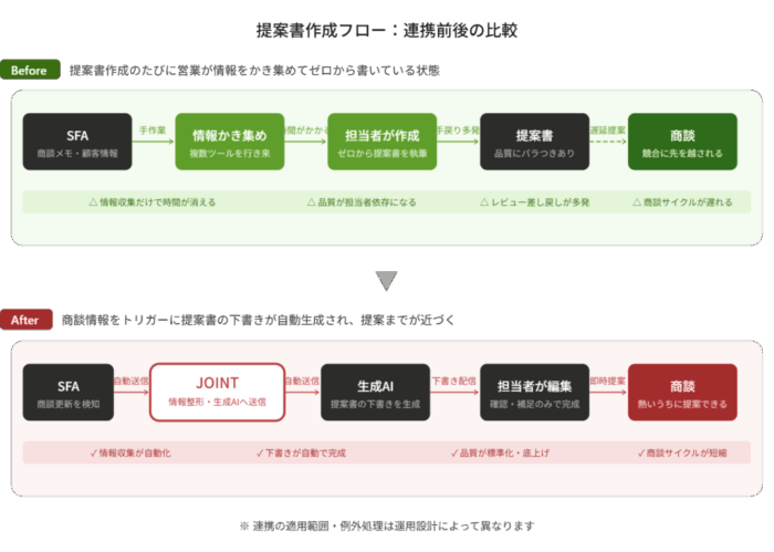 生成AI×SFA×ドキュメント作成をJOINTでつなぐと、提案書作成は次のように変わります。