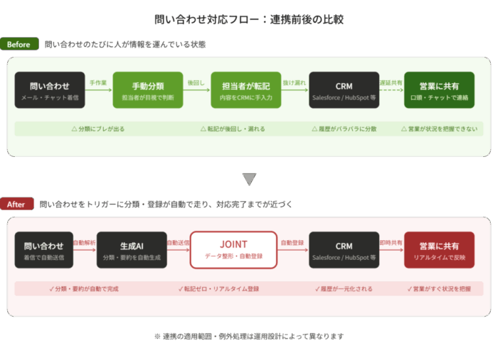 JOINTと連携させると、問い合わせ文を受け取った直後に「カテゴリ」「要約」「対応方針のたたき台」などを自動生成し、CRM登録までを一連の流れにできます。