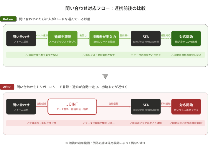 JOINTと連携させると、問い合わせ発生と同時にリードを作成し、担当者通知までを自動化して“入力待ち”の時間を減らせます。