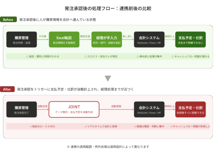 JOINTと連携させると、承認済み発注データを会計へ自動連携し、支払予定や会計処理の前段を早められます。