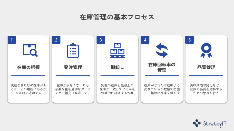賞味期限や劣化など、在庫の品質を維持するための管理も含まれます。