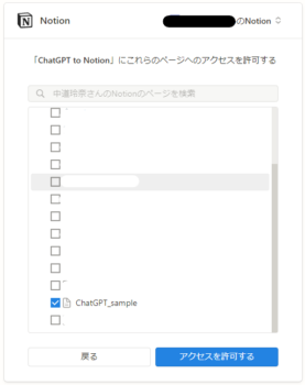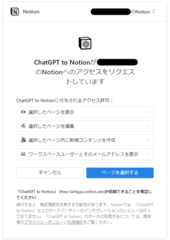 インストールが完了したら、事前準備でNotionに作成したページを選択します。