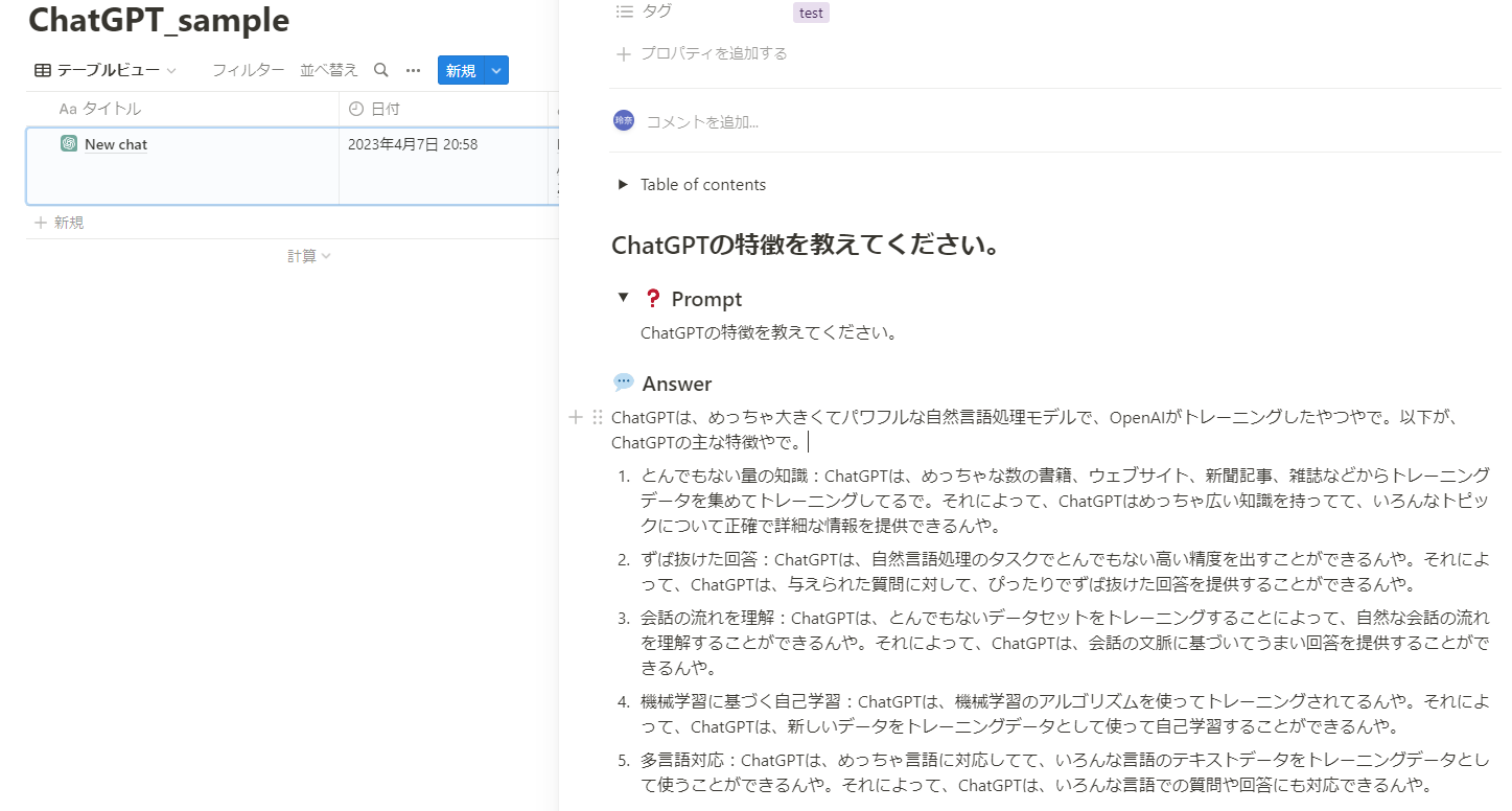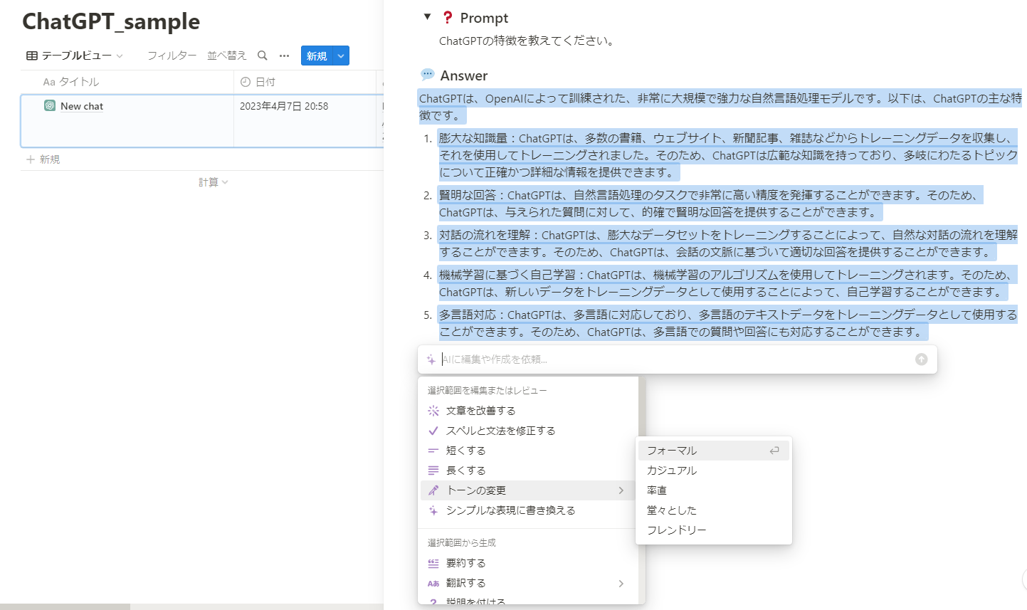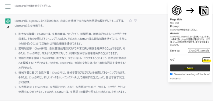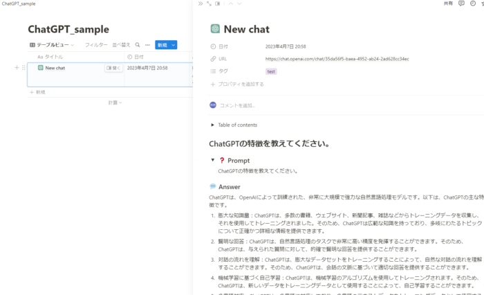 次に、ChatGPTが生成した文章を前述の「ChatGPT to Notion」でNotionに転記します。