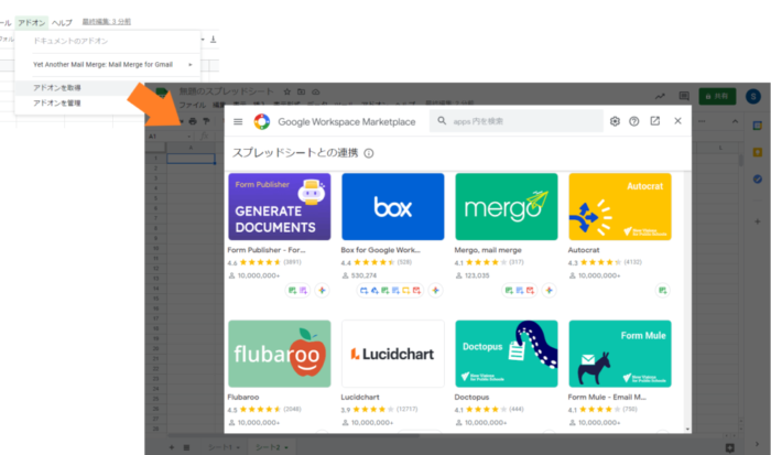 スプレッドシート内にあるアドオン>アドオンを取得 をクリックすると連携できる様々なアドオンが表示されます。