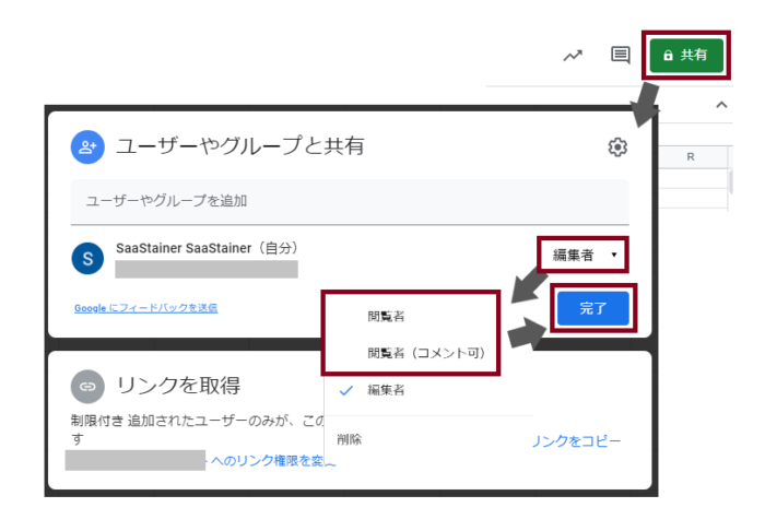 右上にある共有>編集者>閲覧者>完了をクリックすると