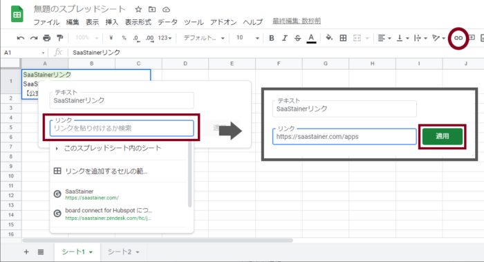 表示させるテキストを入力し、該当のテキストを選択>ハイパーリンクのアイコン>リンクに該当のURLを貼り付け>適用をクリック