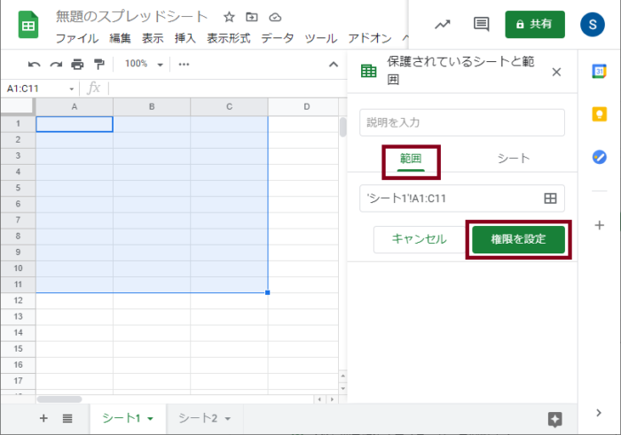 また下記の手順で、範囲を指定すると特定の範囲を保護することも可能です。