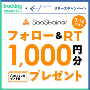 新しい連携アプリ「Backlog原価計算アドオン + freee」のリリースを記念して、2021/03/09(火) ~ 2021/03/14(日) 23:59の期間中、SaaStainer公式Twitterアカウントをフォローし、キャンペーン対象のツイートをリツイートした方の中から抽選で10名様に、Amazonギフト券1,000円分が当たる「Backlog原価計算アドオン + freeeリリースキャンペーン」を実施いたします。