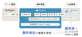 「Hubspotの顧客情報と案件情報をboardに連携する」それだけのシンプルな機能ですが、業務設計という切り口で業務やデータの流れを含めてきちんと上流から下流まで設計し、導入してすぐに業務効率化に貢献できる機能開発をしています。また、boardとすでに連携しているfreeeを活用すると、リード獲得〜案件管理〜入金管理という業務を円滑に行うことが可能になります。