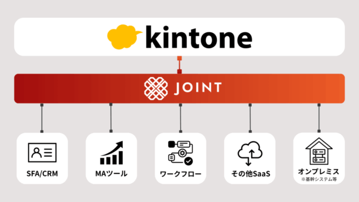 活用シーンが多岐にわたる「kintone」ですが、JOINTを利用することによって、周辺システムとのデータ連携を包括的に管理することができます。