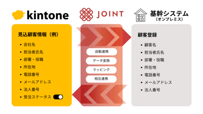 これにより、「JOINT iPaaS」を活用し「kintone」との連携アプリ構築が可能になり、柔軟かつ汎用的な設定で、オンプレミスシステムや基幹システムとの連携も実現できるようになります。