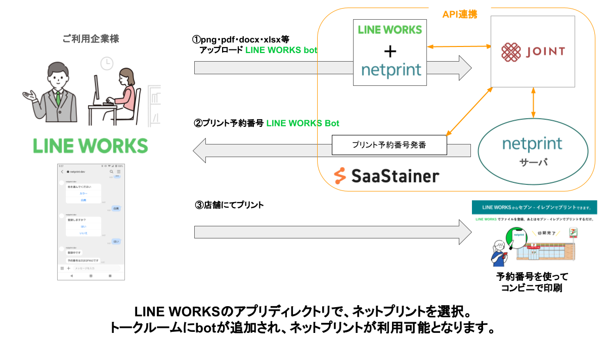 本アプリは、ワークスモバイルジャパン株式会社(本社:東京都渋谷区、代表:増田 隆一)がサービス提供を行うビジネス向けメッセージアプリ「LINE WORKS」と富士フイルムビジネスイノベーション株式会社(本社:東京都港区、代表取締役社長・CEO:浜 直樹)がサービス提供を行う「ネットプリント」を当社のJOINT(ジョイント)によりAPI連携を行っております。