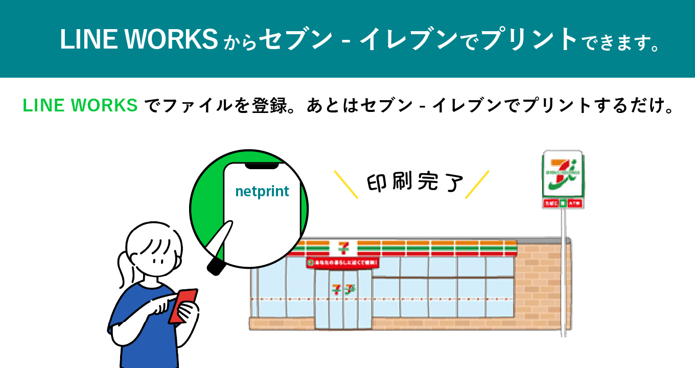 「毎日つかう LINE WORKS で、全国のセブン‐イレブン店舗をビジネスのプリント拠点として活用」できます。※一部未設置店舗がございます。