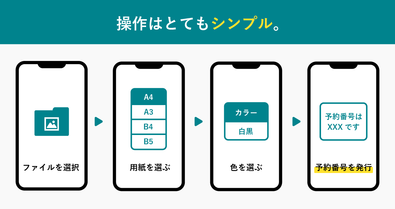・スマホでファイルを選択するだけでプリント番号発行。そのままコンビニで印刷できる。