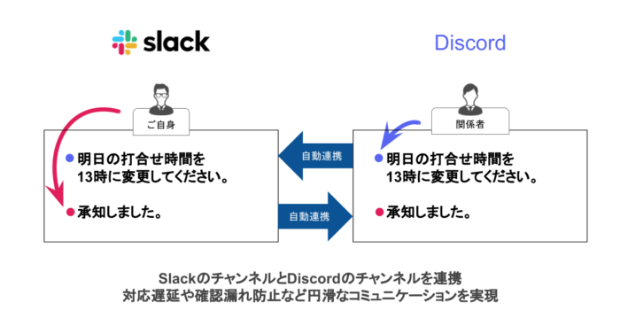 本アプリはビジネス向けメッセージプラットフォーム「Slack」と会話や交流が楽しめるプラットフォーム「Discord」を当社のMaster HubによりAPI連携を行います。