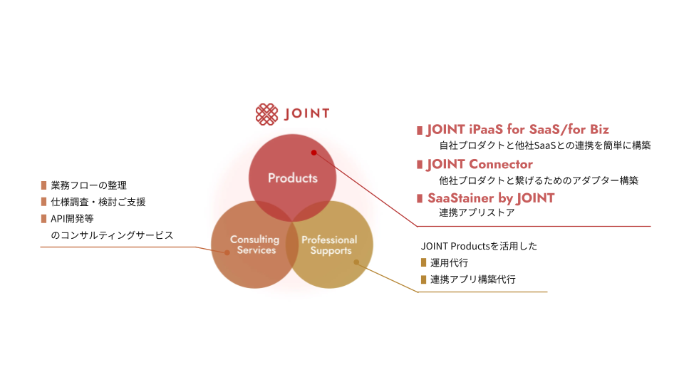 JOINTは、「Products:製品」、「Consulting Services:企画・戦略策定のご支援、API開発等の設計のご支援」、「Professional Supports:製品を利用して期待するビジネス成果を実現するためのサポート」の3つの要素で構成されるプラットフォームです。