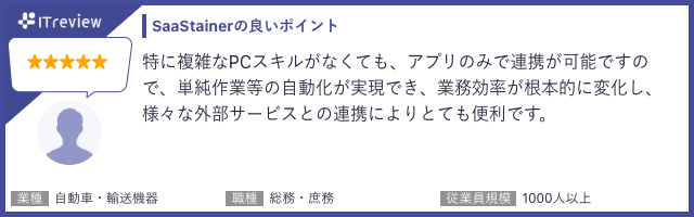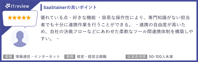 飲食業、自動車、建設業、情報通信、小売業の企業様SaaSのAPI連携ご利用事例(飲食業、自動車、建設業、情報通信、小売業の企業様) IT reviewご紹介事例Master Hub(データ連携開発)SaaSのAPI連携アプリストアSaaStainer(サーステイナー)をご利用いただいている企業様より、IT reviewにてコメントを頂きましたので、一部ご紹介致します。 SaaStainer IT review記事はこちら シェアする